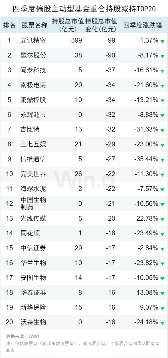 2020年四季度,立訊精密(002475.SZ)、歌爾股份(002241.SZ)、聞泰科技(600745.SH)、南極電商(002127.SZ)和鵬鼎控股(002938.SZ)成為偏股主動型基金減持最多的品種。上述個股在統計期內無一收漲。