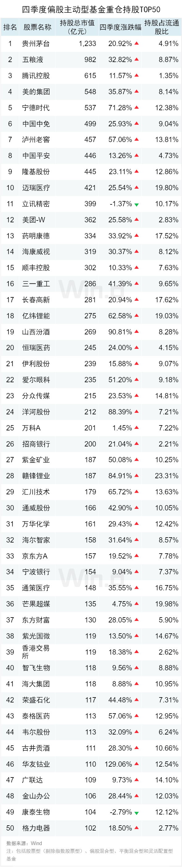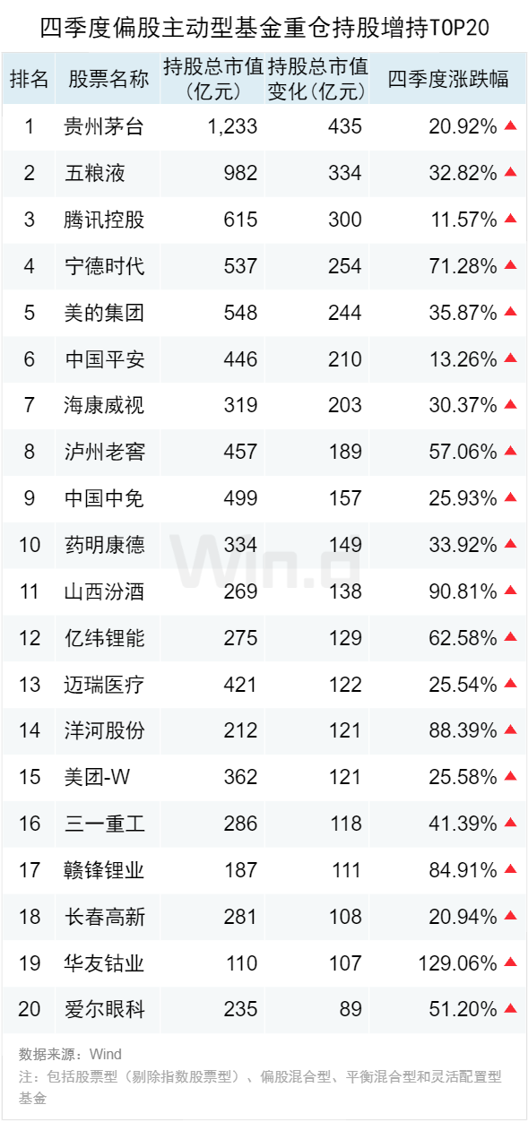 2020年四季度,貴州茅台、五糧液、騰訊控股、寧德時代、美的集團(000333.SZ)成為偏股主動型基金增持最多的個股。