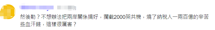對此,有島內網友諷刺蔡英文稱,“然後呢?不想辦法把兩岸關係搞好,攔截2000架‘共機’,燒了納税人一兩百億(新台幣)的辛苦些血汗錢,這樣很厲害?”↓
