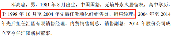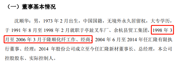 不僅如此,匯隆新材在2014年8月申請在新三板掛牌披露的《公開轉讓説明書》顯示,沈順華先生和匯隆新材董事、銷售副總鄧高忠先生,均在1988年就開始在隆順化纖工作,這不僅與本次發佈的招股書不一致,而且也與隆順化纖在2004年成立的事實不符。對此關鍵信息,匯隆新材的保薦機構浙商證券是否進行過核查?匯隆新材並未回應記者採訪。