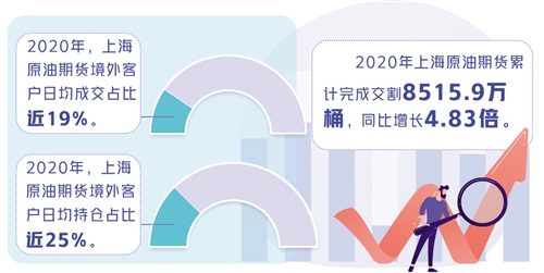 2018年3月26日,我國原油期貨在上海國際能源交易中心掛牌交易,以人民幣計價,向國際投資者開放,首啓我國期市交易端“引進來”大幕,成為我國期市國際化的“領頭羊”。2020年,上海原油期貨境外客户日均成交佔比近19%,日均持倉佔比近25%。全年上海原油期貨累計完成交割8515.9萬桶,同比增長4.83倍。