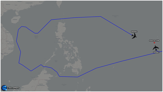 據長期追蹤美軍飛機動態的推特賬户“飛機守望”1月28日發佈的消息,兩架來自美國路易斯安那州巴克斯代爾空軍基地B-52轟炸機於1月25日被部署到關島安德森空軍基地。這兩架B-52轟炸機的呼號分別為PEPSI51和PEPSI52,在它們前往關島的途中,PEPSI51號機直接在關島降落,而PEPSI52號機飛經菲律賓海、蘇拉威西海、蘇祿海上空進入南海,在南海上空飛行後從巴士海峽返回關島安德森空軍基地。