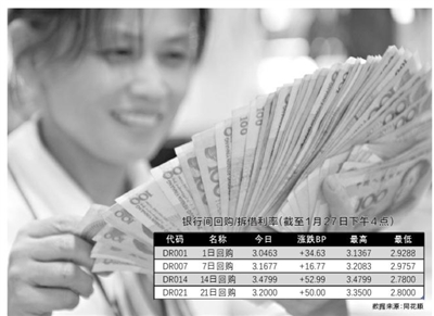 近日,央行公開市場持續大規模淨回籠。1月27日,央行公開市場再度進行1800億元人民幣7天期逆回購操作,中標利率2.2%。當日有2800億元逆回購到期,實現淨回籠1000億元。同花順數據顯示,截至1月27日下午4點,質押式回購隔夜(DR001)、7日(DR007)和14日(DR014)利率分別達3.05%、3.17%和3.48%,分別上漲35個、17個和53個基點。