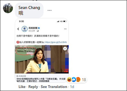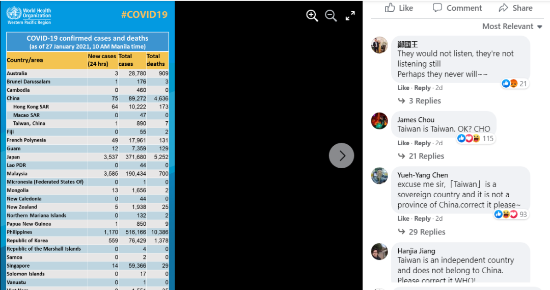 世衞組織此舉讓熱衷炒作所謂“台灣獨立”的台灣當局大為不滿,除了台灣當局經常“責令”世衞組織修改措辭外,不少台灣網民也組隊到世衞組織的各種官方社交媒體賬號下瘋狂刷“台獨”口號,還惡意使用具有種族歧視意味的“武漢肺炎”一詞,宣泄自己的政治狂熱。