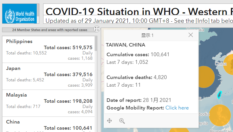 世衞組織將台灣地區標示為“中國台灣”,圖源:世衞組織官網