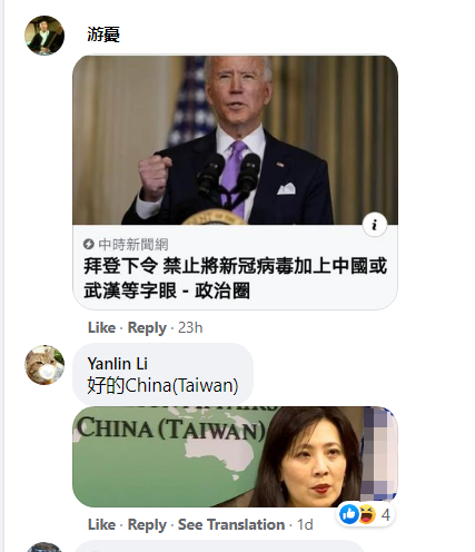 也有人指出,一直被台灣視為“保護傘”的美國,其總統拜登也於近日發言要求不要使用包含對華歧視意味的詞語稱呼新冠肺炎,而台灣島內從官員到媒體,卻堅持與世界主流對立,依然高調使用“武漢肺炎”、“中國肺炎”的稱呼。