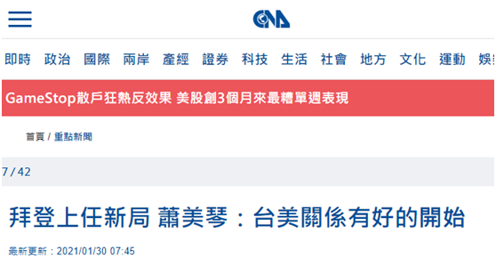 報道稱,台灣“駐紐約辦事處”當地時間29日與費城智庫外交政策研究所(FPRI)合辦視頻研討會,蕭美琴參加。説到“台美關係”時,蕭美琴宣稱“我們有好的開始”,她説,很榮幸參加拜登就職典禮,也聽到國務卿布林肯(Antony Blinken)、國防部長奧斯汀(Lloyd Austin)發表令人欣喜的談話,這都展現雙邊關係重要性與力量,並聲稱“期待與新政府積極合作”云云。
