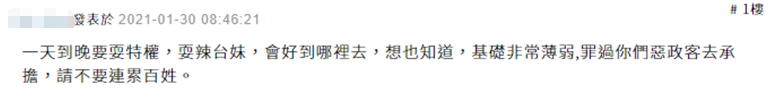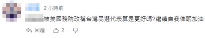 對此,有網友諷刺稱,“一天到晚要耍特權,耍辣台妹,會好到哪裏去,想也知道,基礎非常薄弱,罪過你們惡政客去承擔,請不要連累百姓。”“蔡英文被美國務院改稱‘台灣民選代表’算是更好嗎?繼續自我催眠,加油。”