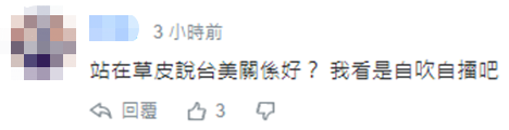 也有人諷刺,“還在編劇”“從草皮開始?”“站在草皮説台美關係好?我看是自吹自擂吧。”