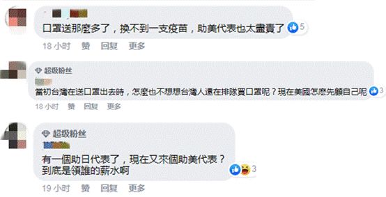 這個消息被台媒報道後,隨即有網友在評論區留言諷刺,有人説,“口罩送那麼多了,換不到一支疫苗,助美代表也太盡責了。”“當初台灣在送口罩出去時,怎麼也不想想台灣人還在排隊買口罩呢?現在美國怎麼先顧自己呢?”“有一個助日代表了,現在又來個助美代表?到底是領誰的薪水啊。”