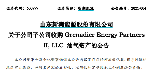 2月1日,新潮能源(SH.600777)發佈公告稱,公司董事會批准公司美國全資子公司Moss Creek擬不高於4.2億美元的價格收購Grenadier Energy Partners II持有的位於美國德克薩斯州霍華德縣的油氣資產。2月3日,新潮能源發佈收購進展公告,稱其美國子公司已與交易對手簽署了《資產購買協議》。