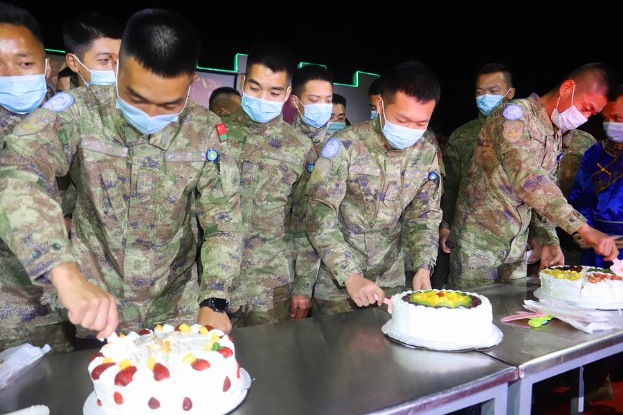 晚會期間,節目組不僅穿插了有趣的遊戲互動和有獎競猜環節,還為近期過生日的官兵準備了驚喜,現場播放了“親人送祝福”的温情短視頻,精心製作了蛋糕給壽星慶祝生日,全體官兵共唱生日祝福歌,讓壽星在海外度過一個難忘的集體生日。“難忘今宵,難忘今宵,無論天涯與海角,神州萬里同懷抱……”精彩的晚會在一曲動聽的《難忘今宵》歌聲中徐徐落幕,隊領導與全體歌手上台合影留念。