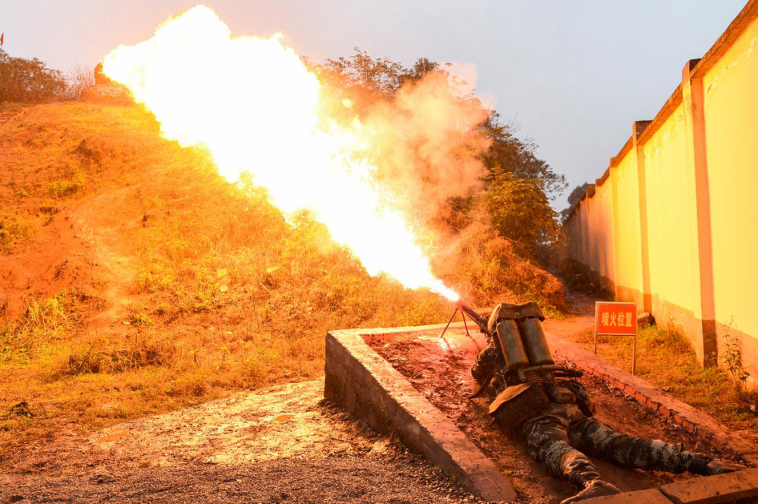 一條“火龍”向目標撲去。1000攝氏度的火焰温度,足以令人驚心膽顫。