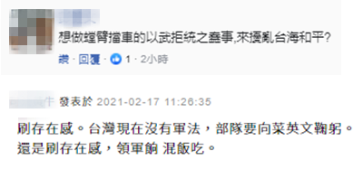針對此事,有網友在台媒評論區留言表示是“刷存在感”;也有網友質疑“想做螳臂擋車的以武拒統之蠢事,來擾亂台海和平?”