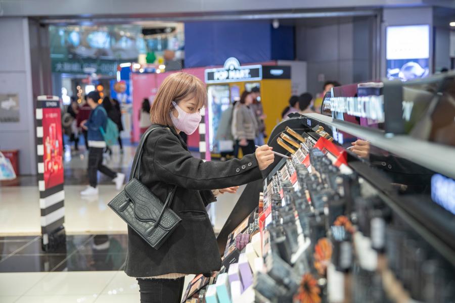 2月15日,在重慶市江北區觀音橋商圈一家商場內,市民在美妝店選購心儀的美妝用品。新華社記者 黃偉 攝