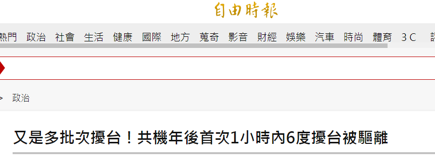 報道稱,根據廣播及航跡記錄,“中共軍機”上午10時55分、11時06分、11時08分、11時14分、11時17分、11時38分,共6度“襲擾”台西南“防空識別區”,高度分別為1800公尺(米)至8600公尺,台空軍在空“監控”並廣播“驅離”。