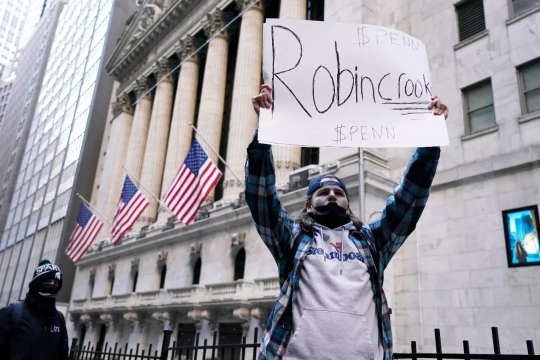 ▲證券交易軟件Robinhood(羅賓漢)對散户“拔網線”之後,示威者在紐約證券交易所門口打出Robin Crook(羅賓騙子)的標語
