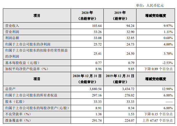據蘇州銀行2020年度業績快報,截至2020年末,該行營業收入103.64億元,同比增長9.97%;歸屬於上市公司股東的淨利潤25.72億元,同比增長4.00%。在7家已公佈業績的城商行中,蘇州銀行淨利潤增速居中,而廈門銀行、長沙銀行和青島銀行淨利潤增速分別為6.55%、5.08%、4.78%,好於行業整體水平,引發市場關注。