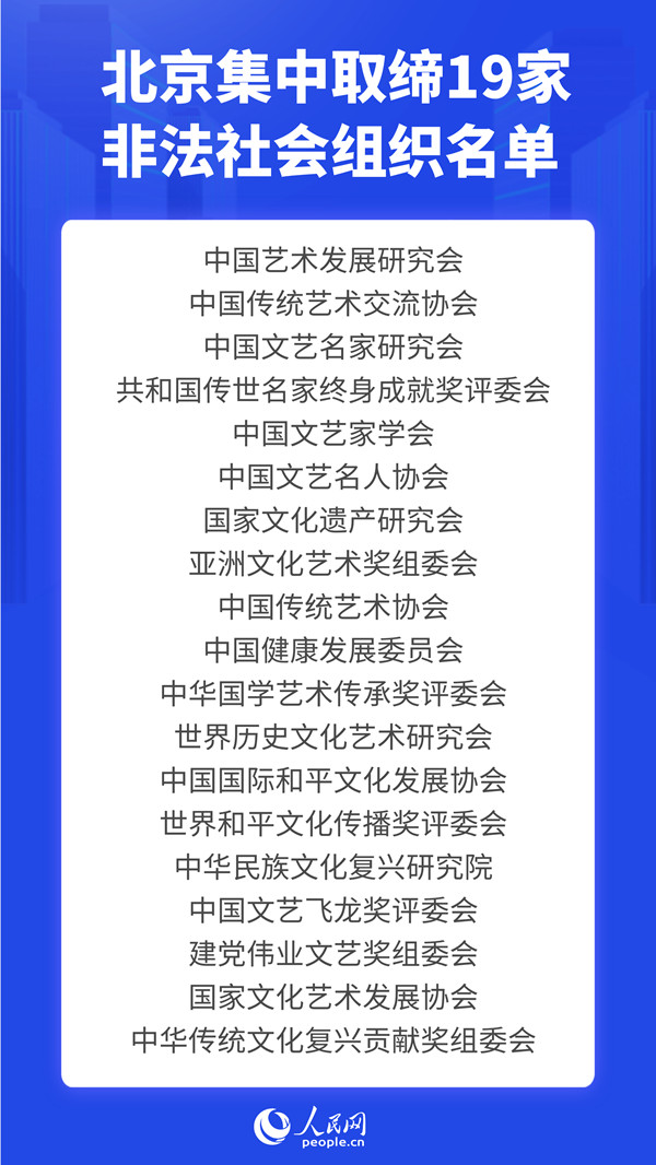 人民網北京2月19日電 (記者李源)據民政部社會組織管理局消息,為防範化解社會領域風險,本月,北京市民政局統一部署,對“中國藝術發展研究會”“中國傳統藝術交流協會”“建黨偉業文藝獎組委會”“中國文藝名家研究會”“中華國學藝術傳承獎評委會”和“共和國傳世名家終身成就獎評委會”等19家未在民政部門登記,擅自以社會組織名義進行活動的非法社會組織予以集中取締。