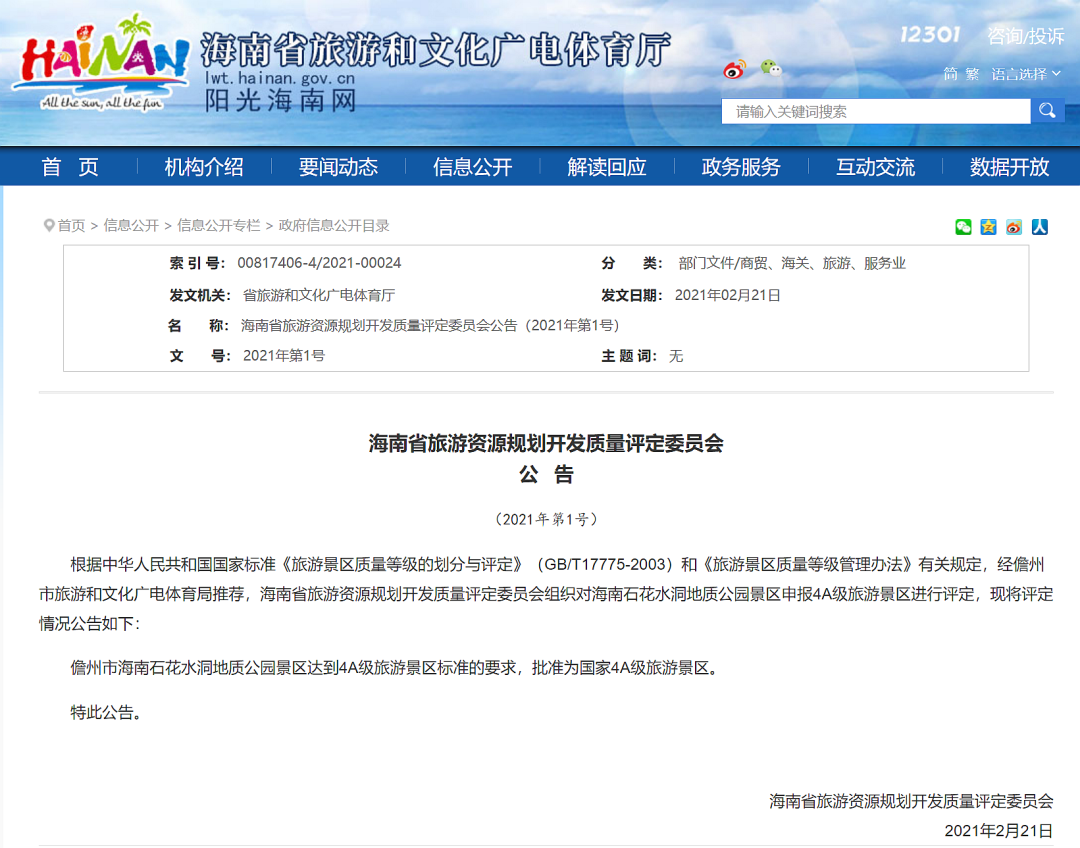 2月21日,海南省旅遊資源規劃開發質量評定委員會發布公告,儋州市海南石花水洞地質公園景區 達到國家4A級旅遊景區標準要求,批准為國家4A級旅遊景區 。