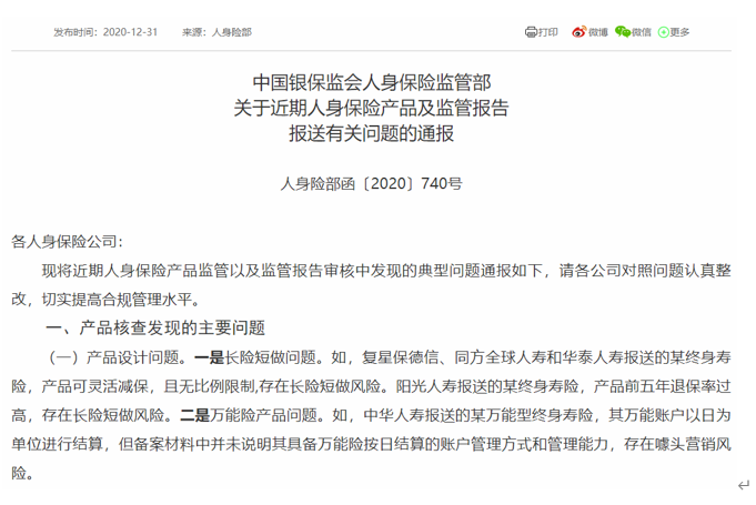 實際上,“長險短做”問題,一直是監管重點關注對象。過去兩年,銀保監會對人身保險產品問題通報了5次,均提到長險短做。