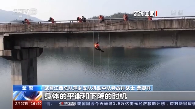 武警江西總隊萍鄉支隊機動中隊特戰排戰士 曹卿祥: 橋樑索降不同於我們平時訓練的房屋索降。橋樑索降在下降的過程中受風力的影響不利於控制身體的平衡和下降的時機,所以在下降的過程中我們要克服風力的影響,抓準時機精準下落。