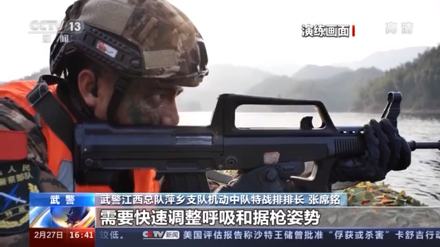 武警江西總隊萍鄉支隊機動中隊特戰排排長 張席銘: 乘船射擊要求射手快速掌握目標和船晃動的規律,其次射手在高強度的體能消耗後,需要快速調整呼吸和據槍姿勢才能精確打擊目標。