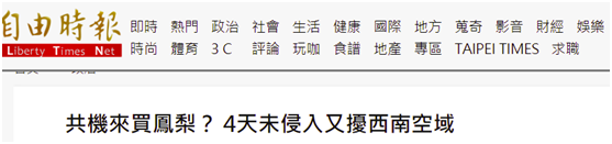 台灣《自由時報》稱,根據廣播及航跡記錄,“共機”於今天(28日)中午11時55分進入台灣西南領域,迨空軍宣稱“予以廣播驅離”。報道還在標題中吐槽“共機來買鳳梨”?