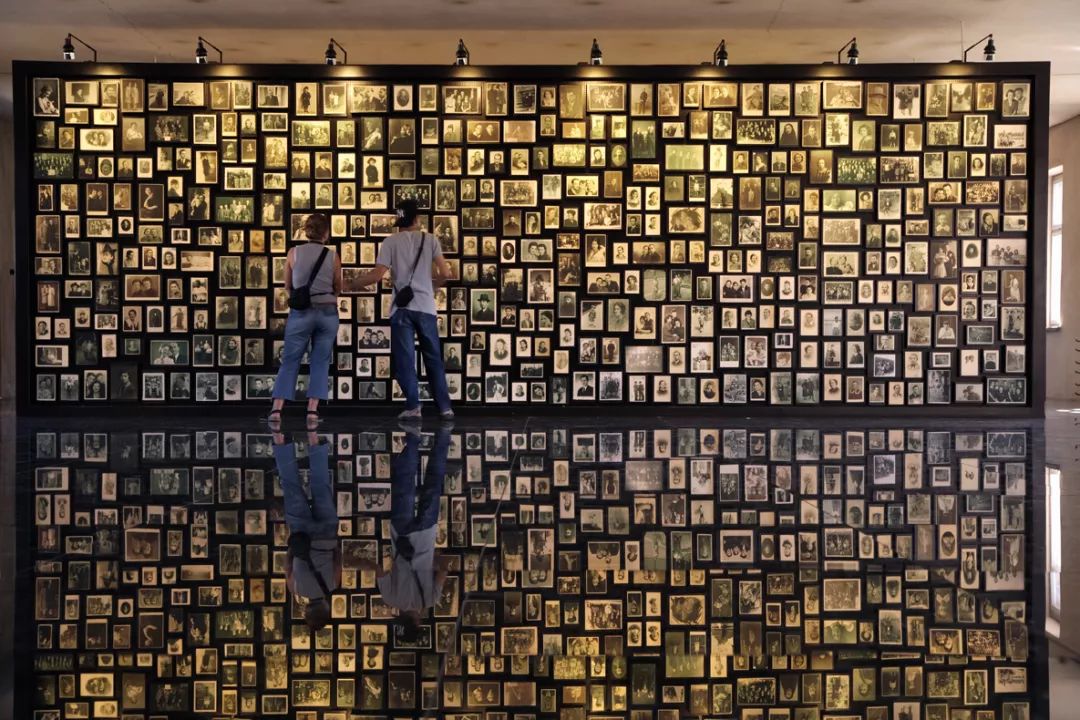人們駐足於奧斯維辛博物館一面懸掛諸多照片的牆壁前(圖源:GQ)