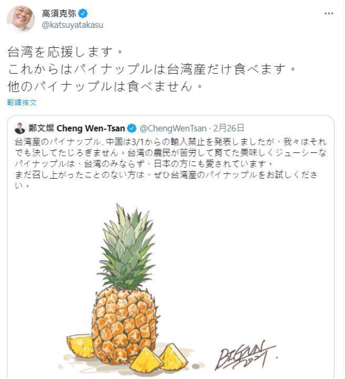 據台灣“三立新聞網”報道,國台辦宣佈從3月禁止台灣鳳梨輸入大陸後,先是蔡英文跳出來在臉書上召台灣民眾吃鳳梨,桃園市長鄭文燦更是用日文在推特上寫下長文,稱台灣農民種的鳳梨美味多汁,不僅台灣人,日本人也很喜歡。他還附上一張鳳梨的插畫,並在文末喊話“如果您還沒有嘗試過,請一定要試試台灣的鳳梨!”27日,日本整形醫生高須克彌也跳了出來。他在推特轉發鄭文燦的貼文,聲稱力挺:“為台灣加油!從今天起我只吃台灣鳳梨,不吃其他的!”