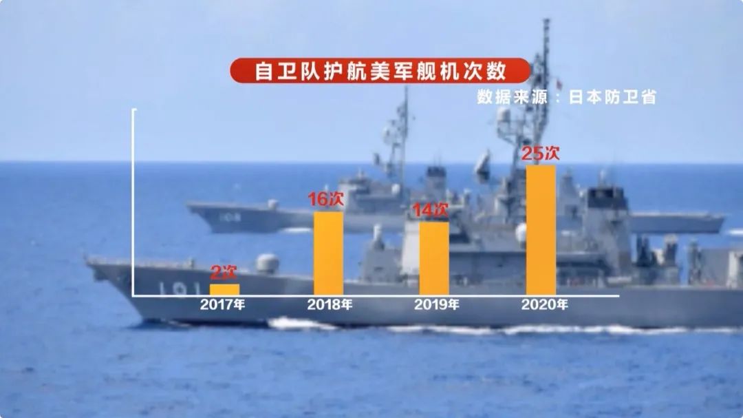 日本通過安保法後,自衞隊從2017年開始為美軍護航。防衞省2月公佈的數據顯示,2020年,自衞隊共為美軍戰艦和戰機護航25次,創下2017年以來的新高。
