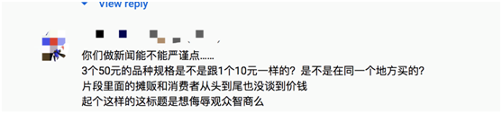 “你們做新聞能不能嚴謹點……3個50元的品種規格是不是跟1個10元一樣的?是不是在同一個地方買的?片段裏面的攤販和消費者從頭到尾也沒談到價錢。起個這樣的這標題是想侮辱觀眾智商麼”