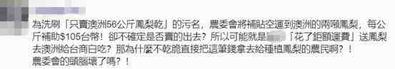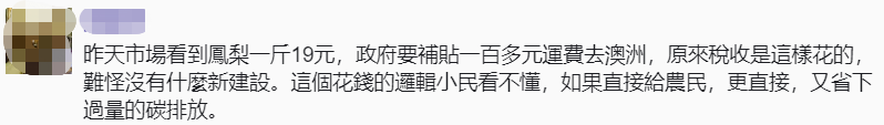 有網友説,“政府”要補貼一百多元運費把鳳梨送到澳大利亞,這個花錢的邏輯實在看不懂,為什麼不乾脆直接把這筆錢拿去給種植鳳梨的農民?↓