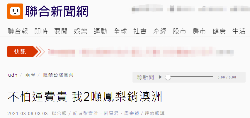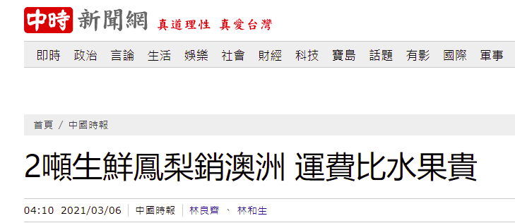 據台灣“聯合新聞網”、中時新聞網報道,台灣農政部門宣傳去年台灣生鮮鳳梨成功外銷澳大利亞,卻被踢爆因疫情影響,僅外銷56公斤鳳梨乾,如今農政部門祭出高額空運費,全力拼澳大利亞市場,每公斤補貼105元。世界台灣商會聯合總會前會長林見松昨(5日)證實,將有兩噸台灣生鮮鳳梨輸往澳大利亞,一噸銷去墨爾本,一噸銷往布里斯本。