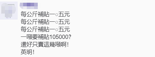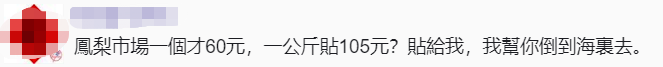 對於台灣“農委會”每公斤補貼105元往澳大利亞銷鳳梨,有島內網友諷刺稱“英明”:“一噸要補貼105000?還好只賣這幾噸啊!”“貼給我,我幫你倒到海里去。”↓