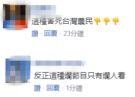 還有人表示,“反正這種爛節目只有爛人看”“這種害死台灣農民”。