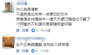 對於他的“道歉”,有島內網友並不認同,稱“你以為是道歉…不過就是出來秀一波硬凹的功夫,想學陳吉仲陳時中一樣天天硬凹蹭個位子罷了。”“主子正焦頭爛額,走狗放火被修理。”