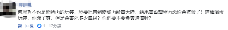 也有網友提到,“博恩秀不也是開豬肉的玩笑,説要把萊豬變成肉鬆賣大陸,結果害台灣豬肉恐怕會被禁了!這種混蛋玩笑,你開了爽,但是會害死多少農民?你們要不要負責賠償呀?”
