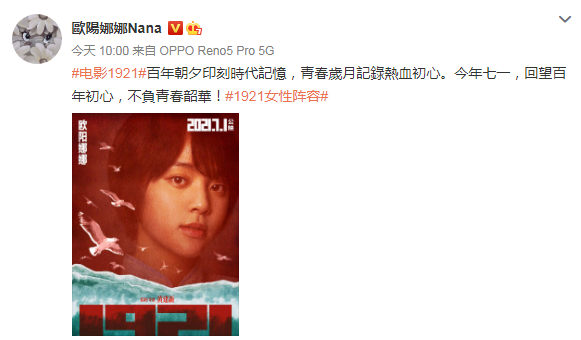 歐陽娜娜8日上午在微博發佈她的劇照並寫下,“#電影1921#百年朝夕印刻時代記憶,青春歲月記錄熱血初心。今年七一,回望百年初心,不負青春韶華!#1921女性陣容#”