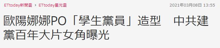 除此之外,此事也引起了台媒的關注,台灣“ETtoday新聞雲”以“歐陽娜娜PO‘學生黨員’造型 中共建黨百年大片女角曝光”為題做了報道。