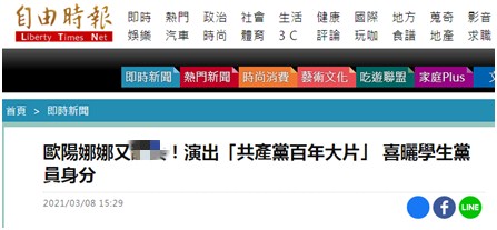 然而,親綠的《自由時報》卻相當酸,説她“喜曬學生黨員身份”,還氣急敗壞指責歐陽娜娜“舔共”。