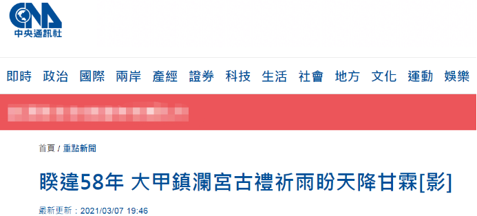 台灣“中央社”、聯合新聞網等台媒稱,台灣遇到56年來最大旱災,台灣“農田水利署”請與有“雨水媽”之稱大甲鎮瀾宮7日上午合辦祈雨法會,而這也是鎮瀾宮時隔58年後再辦祈雨法會。