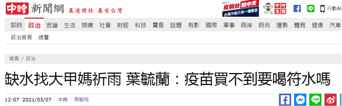 國民黨“立委”葉毓蘭也質疑,台灣現在有臨渴掘井的“經濟部長”、向媽祖祈雨的農業主管,“搞不好疫苗買不到後,也會要我們喝符水保平安。“