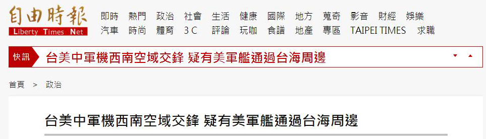 台灣親綠媒體《自由時報》3月10日以“美中軍機西南空域交鋒,疑有美軍艦通過台海周邊”為題報道稱,當天下午3時許,解放軍軍機再次進入台灣西南空域,在同一時間台軍戰機升空,還有美軍機在附近出沒。報道還稱,據長期關注區域動態的軍事迷研判,應有美國軍艦通過周邊海域。