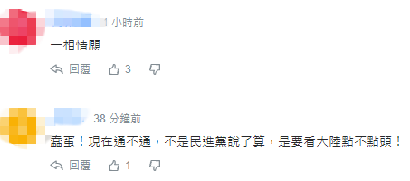 也有網友表示台當局是“一廂情願”,還有人一針見血稱,“蠢蛋!現在通不通,不是民進黨説了算,是要看大陸點不點頭!”