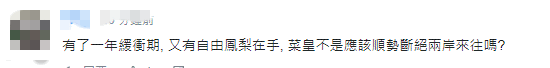 對於邱垂正的説法,有網友在媒體評論區留言譏諷,“這違反了綠營的期待啊!”“有了一年緩衝期,又有自由鳳梨在手,蔡英文不是應該順勢斷絕兩岸來往嗎?”