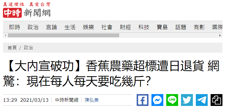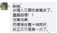 不少網友在臉書留言吐槽,“台灣人又要吃香蕉皮了,農藥超標!?沒事沒事,把標準放寬十倍就好,反正又不是第一次了”。