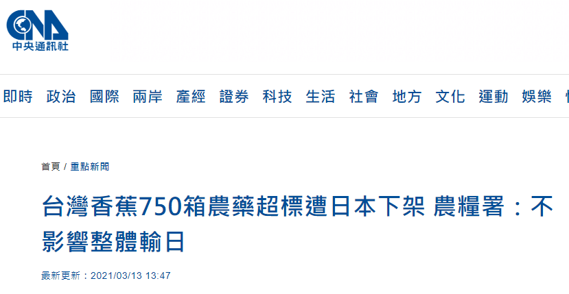 據台灣“中央社”“中時新聞網”等媒體3月13日報道,日本食品公司Wismettac(日本西本貿易公司)10日在官網公告回收台灣產香蕉,原因是檢出殺菌劑百克敏0.12ppm,為標準上限值的6倍。