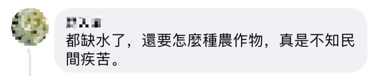 還有網友提到了最近台灣連日干旱缺水的問題:“都缺水了,還要怎麼種農作物,真是不知民間疾苦。”↓