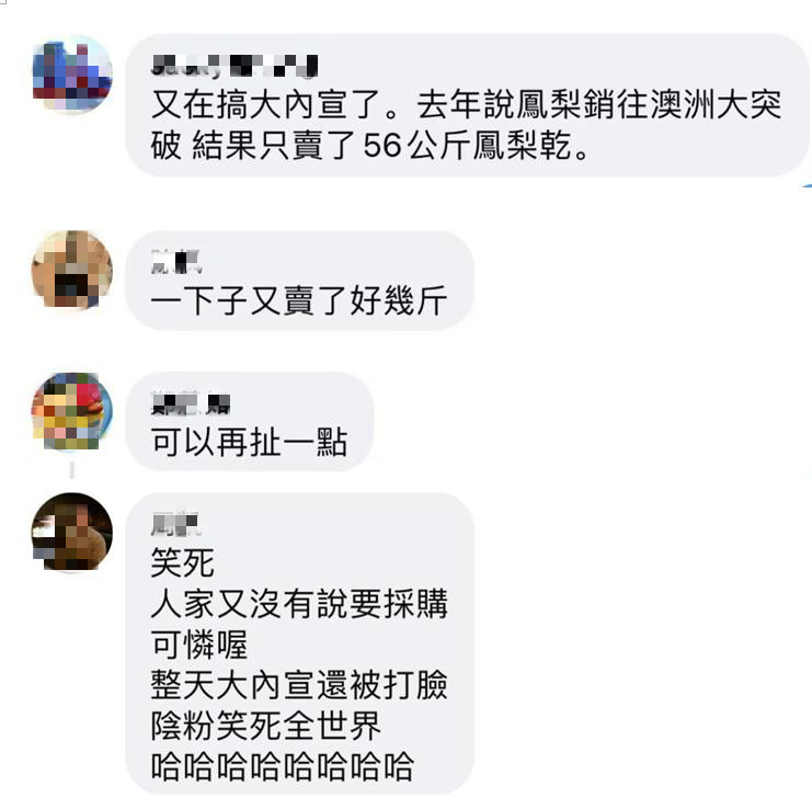 對於台當局這番自我炒作的行為,有網友批評諷刺説,“又在搞大內宣了。去年説鳳梨銷往澳大利亞大突破,結果只買了56公斤鳳梨乾”“一下子又賣好幾斤”。↓